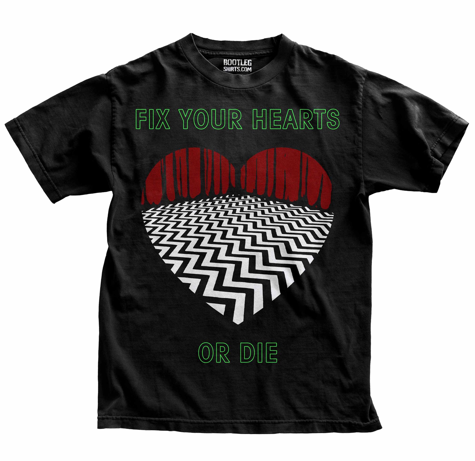 Premium soft-style cotton graphic tee featuring the viral “Fix Your Hearts or Die” design. Perfect for fans of dark cult TV humor, 90s nostalgia, and meme streetwear.