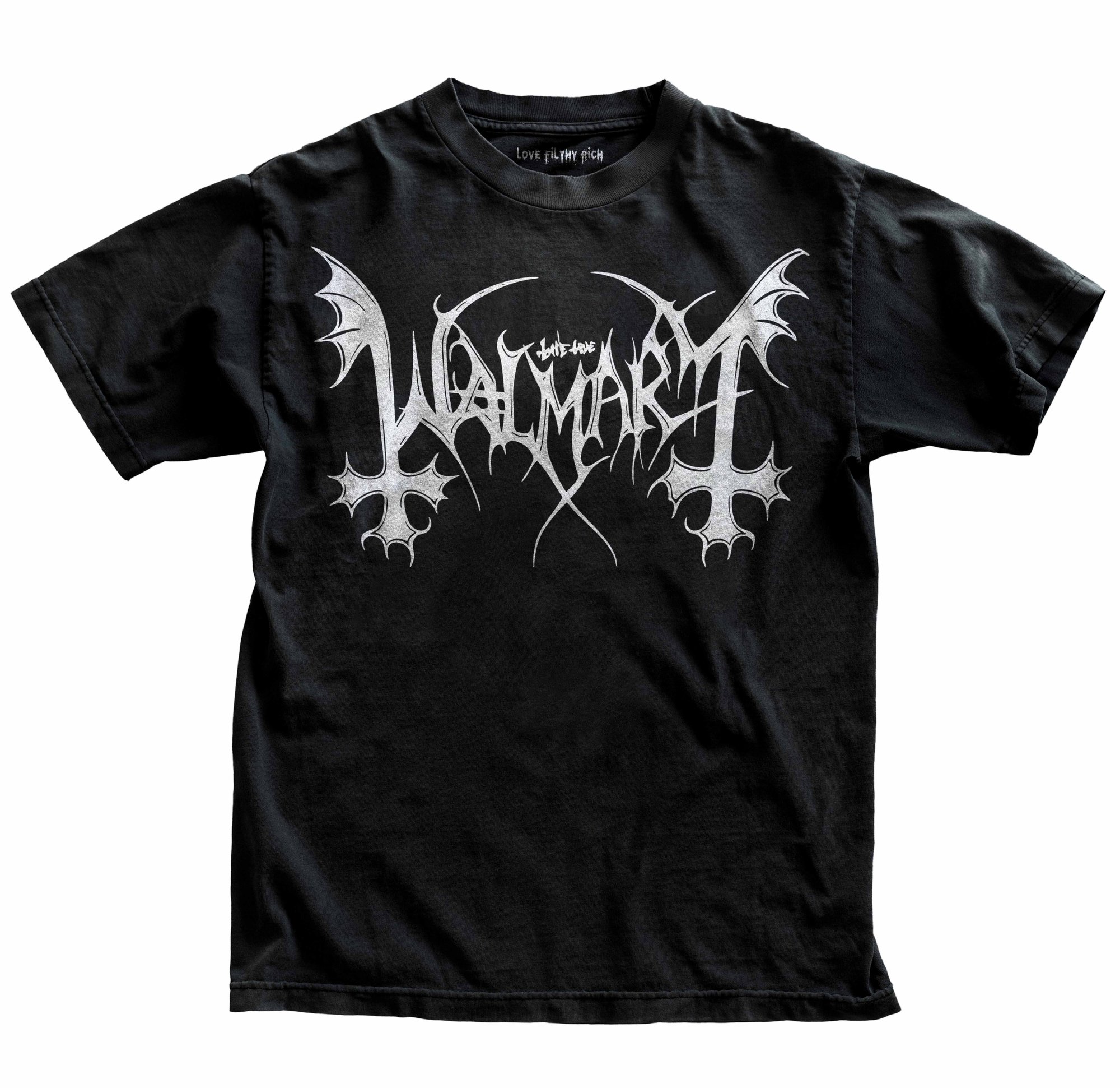 Premium soft-style cotton graphic tee featuring the legendary Walmart death metal logo parody. The shirt that broke the internet.